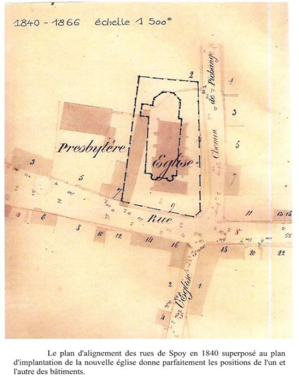 On ne peut pas parler de l’église de Spoy que l’on voit aujourd’hui sans évoquer au moins succinctement l’ancienne église qui la précédait. Il s’agissait d’une église romane en forme de T dont la majeure partie datait du XIIIe siècle à laquelle on avait ajouté la chapelle Saint Thibaut et la sacristie contre le chœur. Elle était à la place de l’église actuelle mais orientée à l’inverse de celle d’aujourd’hui avec le chœur à l’Est et l’entrée à l’Ouest. ( voir plan ci-dessous )