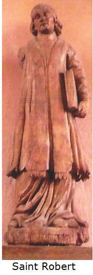 Au dessus de la porte d’accès à la nef sont présentées trois sculptures en bois, deux statuettes provenant d’anciens bâtons  de procession du XIIIe siècle, un saint Vincent et un saint Eloi ainsi qu’une statue beaucoup plus ancienne de saint Robert provenant d’une chapelle située à Treige et détruite en 1792.