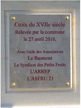 "Croix du XVIIe siècle relevée par la commune le 27 avril 2016 avec l'aide des associations :